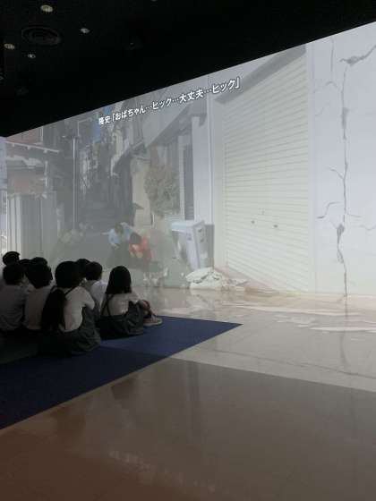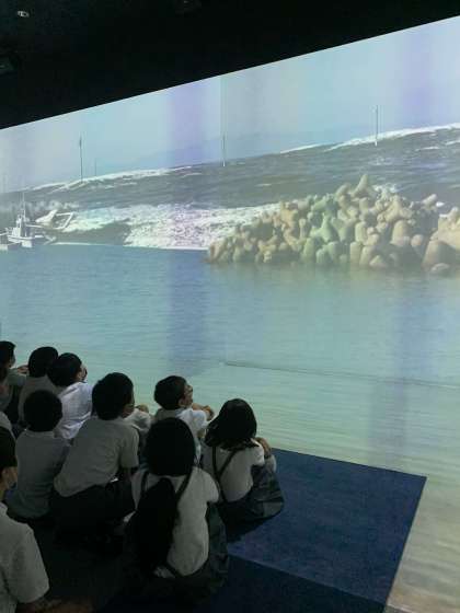 地震が起きて津波が発生した時の様子を体感しました。実際に起きた時、どの様な事に気を付ければよいか考えました。