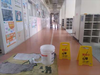 新館の1階廊下のワックス掛け。綺麗な学校で児童生徒の皆さんを迎える準備をしています。
