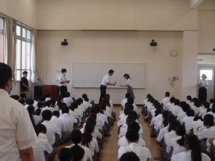 始業式後、中学校の全校集会は、バドミントン部で表彰があり、その後学習面、生活面から2学期に向けての話がありました。