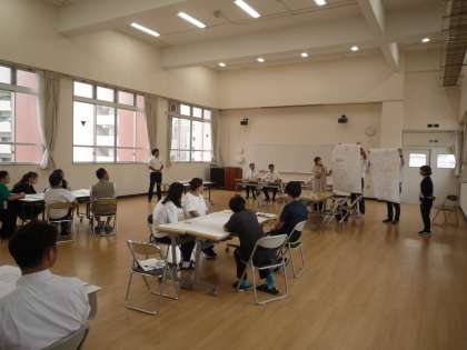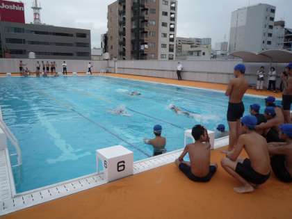 6限目は、9年生の男子体育で研究授業が行われました。水泳のリレーでの引継ぎの仕方をグループで考えながら前回の記録を更新する目的で、全グループが更新できました。