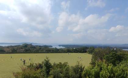 昼食を採り芝生の広場で思いっきり走り回っている6年生は、この後、志摩を後にします。