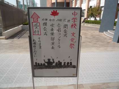 本日、中学校は文化祭になっております。13:35から舞台の部が始まります。
