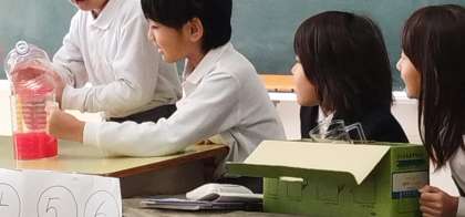 ペットボトルに入っている水のかさを予想したあと、実際にはかって確かめます。