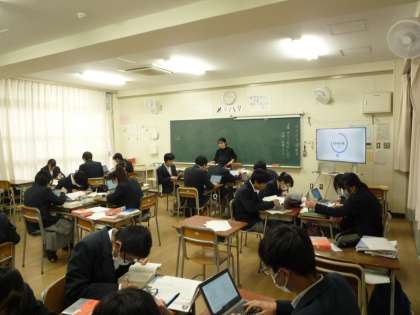 9年生の国語で、語句の意味調べを一人一台端末をつかって行う取り組みがありました。班で協力して、たくさんの語句の意味を確認していました。