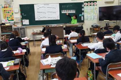 けんばんハーモニカでのゆびくぐりやゆびまたぎの練習をしています。今日は、紙のミニけんばんハーモニカでやっています。