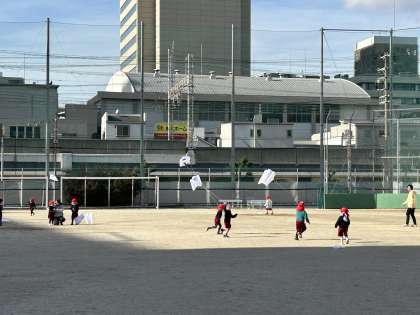 日東幼稚園の園児たちが学校に来てくれて、元気いっぱい凧あげを楽しんでいます。