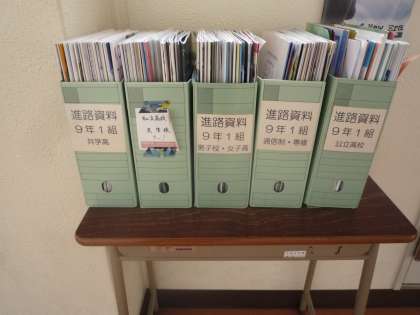 本日、学期末懇談最終日になっております。9年生においては進路について重要な話もあります。待合室にはたくさんの高校のパンフレットや資料が置かれています。