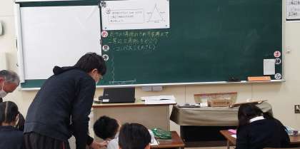 コンパスを使って、二等辺三角形をかく学習をしています。