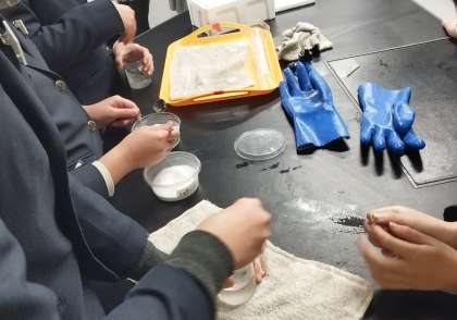 水の温度を変えて、ミョウバンのとける様子を調べる実験です。