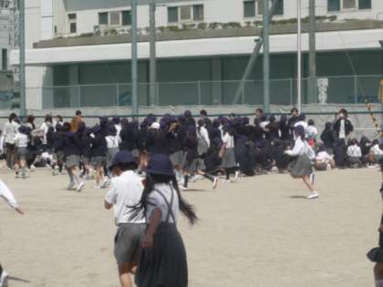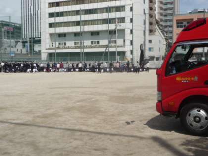 3時間目に避難訓練が行われました。避難の放送から4分29秒で整列し人数確認ができました。
