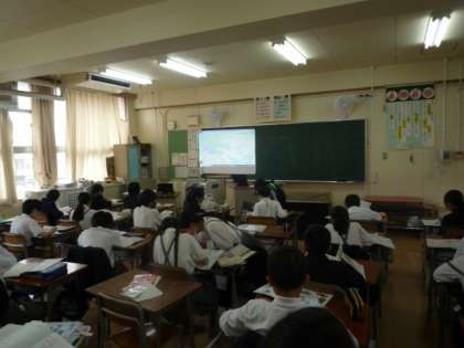 中学校の英語の教員が小学校5年生と6年生に授業を行います。小中一貫校の特徴の一つです。教科書にでてくる国を楽しそうに調べています。
