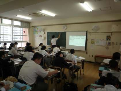 9年生の英語で、教科書の英文にある文法や熟語を学ぶ取り組みがありました。例文をもとに様々な問題にチャレンジしていました。