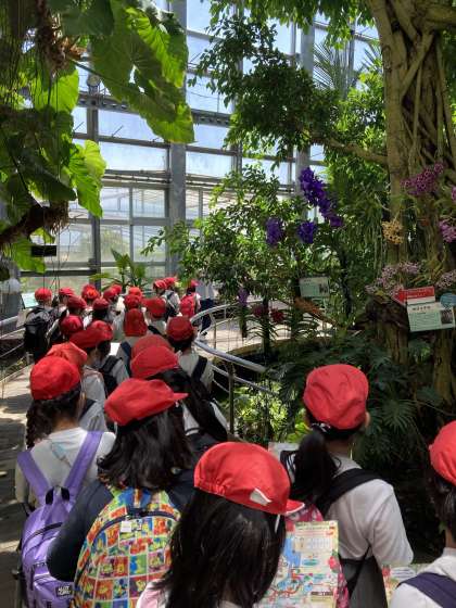 咲くやこの花館で珍しい植物をみながらクイズラリーをします。楽しんでいます。