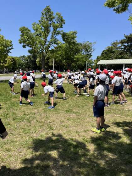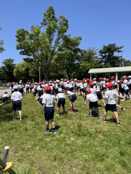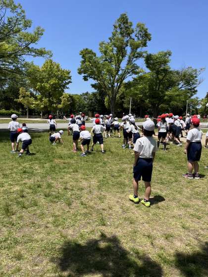 全員ゴールしました なぞなぞの答え合わせをしました。 これから、4年生全員で「だるまさんが転んだ」大会をします。