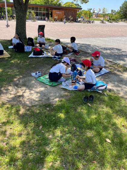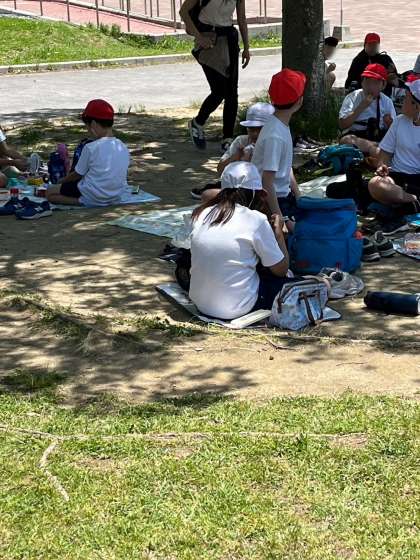 お楽しみのお弁当タイムです グループで丸くなって 全員で「いただきます」