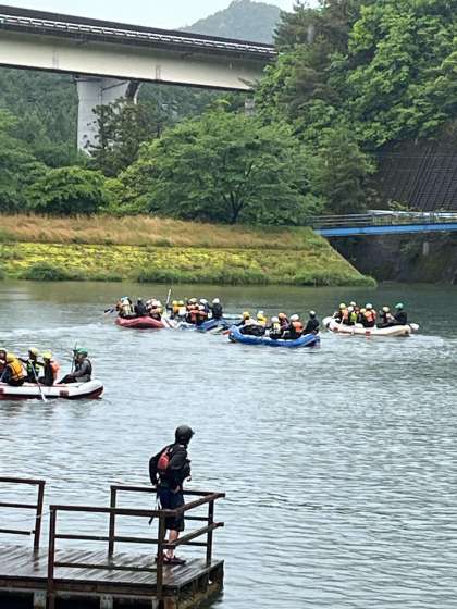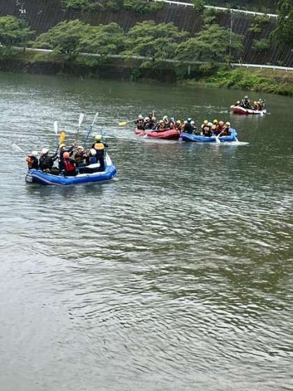 ラフティングボートでのレースをしていますが、クルクルとボートが回ってしまい、前進しないボートもあります。がんばって。[image1.jpeg][image2.jpeg]
