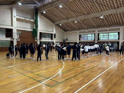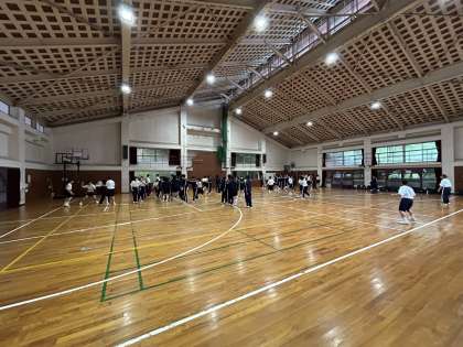 体育館では最後にじゃんけん列車です。じゃんけんで負ければ勝った人の後ろにつき、どんどん長い列車を作っていきます。最後には一つの大きな一つの列、大きな輪になりました。