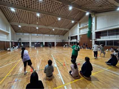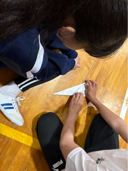 紙飛行機バトル。 3人1組で2分間で指示された大きさの紙で紙飛行機を作り、 遠くに飛ばす競技。