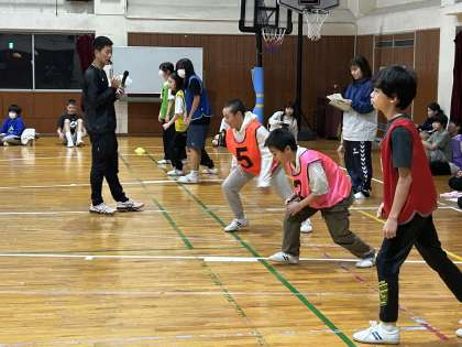 借り物競争。お題にあったものを借りに行き、先生からOKをもらい、ゴールまで運ぶ速さを競います。お題は、晩御飯をお代わりしました人、誕生月が1月の人などなど。