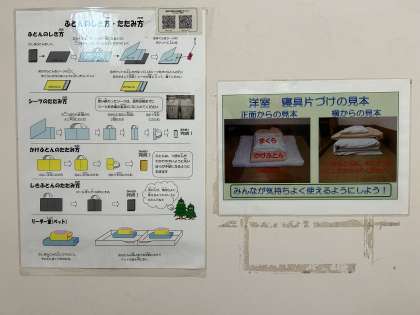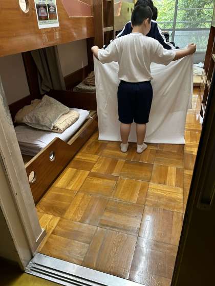 6:30に起床し、布団を館内の指示通りにたたんでいます。昨日はぐっすり眠れたかな。