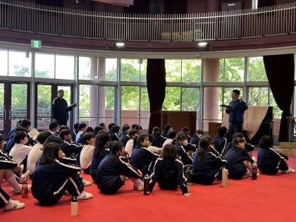 オリエンテーションホールで朝の集いです。この後の流れの説明を先生から受けています。今日もしっかり話を聞いて自分たちで考え行動しましょう。