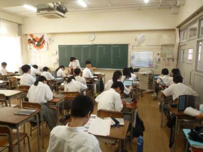 本日から授業が始まります。8年生の英語で、端末も利用しながら課題を解く授業がありました。頑張って取り組んでいました。