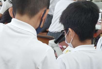顕微鏡を使ってヘチマの花のつくりをみています。