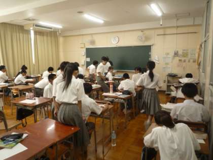 7年生の国語で、作文をつくる取り組みがありました。悩みながらも、しっかりと書いており、できたものを順に添削してもらいました。
