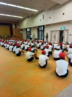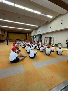 雨天プログラム、チームビルディングの会場に到着し、説明を聞いています。