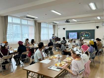 栄養教諭による、給食のメニューや給食室での調理の様子、子どもたちが安全に食べられるように注意していることなどの話がありました。