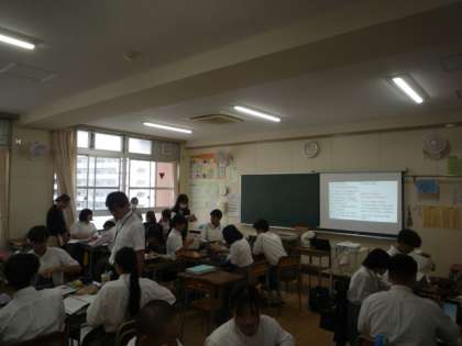 6限目、9−2で英語の公開授業が行われました。特定の人物を記者会見形式で発表するため、グループ学習で準備をする取り組みがあり、一人一台端末も使いながら協力してプリントをまとめていました。