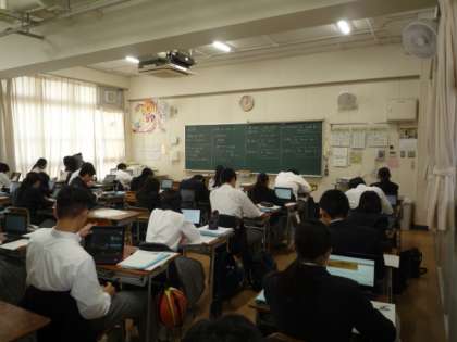 8年生の英語で、文法を使って表現する授業がありました。一人一台端末も使いながら、さまざまな文法を確認していました。