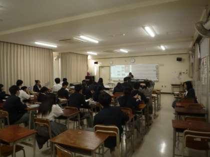 9年生の音楽で能について学ぶ授業がありました。映像もみながらその歴史から記録をとっていました。