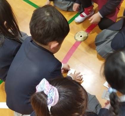 1年生と園児がグループになって、ぱっちんがえるで遊んでいます。