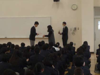中学校の全校集会で、バドミントン部と男子バスケットボール部で表彰がありました。おめでとうございます!その後、これからの過ごし方について話がありました。