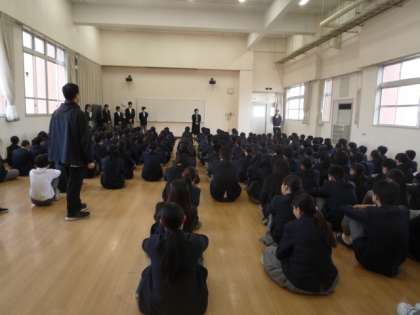 本日、8時25分から全校集会があり、校長先生、生活指導の先生からお話がありました。これからも毎週月曜日8時25分から全校集会がありますので、遅れないように集合しましょう。