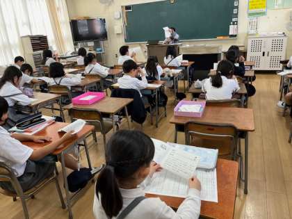 5月7日(水)5時間目、3年2組は遠足のしおりを使って万博への遠足の注意点を聞いていました。