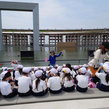 これから始まる、「水のショー」を観る準備をしています。子どもたちは、とても元気です。