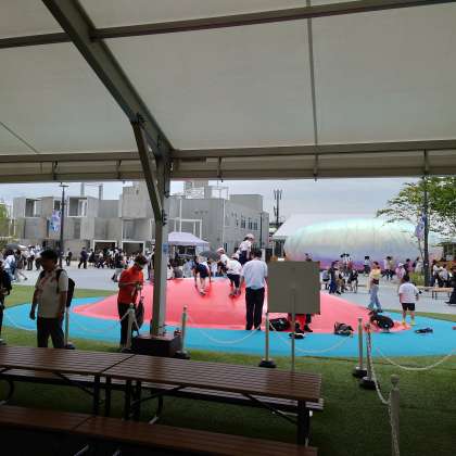 昼食後、子どもたちは元気で、ミャクミャクの柔らかい遊具で遊んでいます。