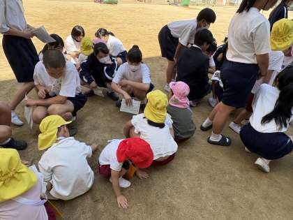 なみはやまつりに日東幼稚園の園児さんたちが遊びにきてくれました。7年生が園児さんと一緒にお店をまわります。まわる前に班になって、仲よくあいさつしました。