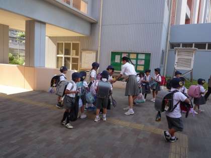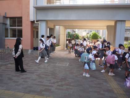 小学生も中学生も朝から元気よくあいさつして登校しています。