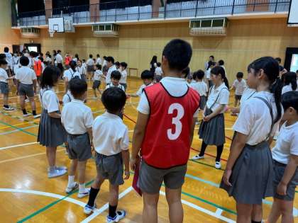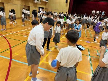 7月3日(木)児童集会はたてわり班でボール送りで楽しみました。大きいボールは3回バウンドさせて次の人に回します。小さいボールは何もせずに次の人に回します。小さいボールが大きいボールに追いついたらアウトです。