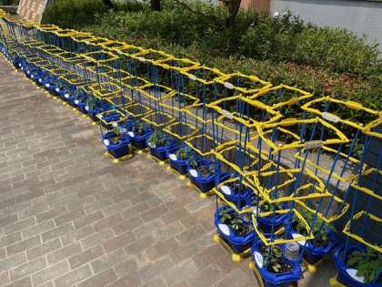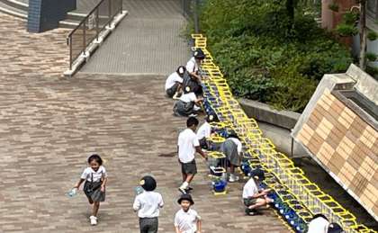 7月3日(木)1年生が休み時間にアサガオに水をあげにいっています。植木鉢に支柱も用意できました。大きく育ってほしいですね。