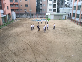 5月10日火曜日 午前中は曇り空ながらなんとか雨も降らず、お昼休みに3年生が中庭でサッカーを行っていました。今までのグラウンドのことを思うと狭いのですが、本校がマンモス校の時代、運動場はここしかなかったことを考えると、当時どのようにして運動会や体育の授業を行っていたのかなと思います。