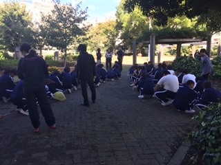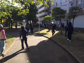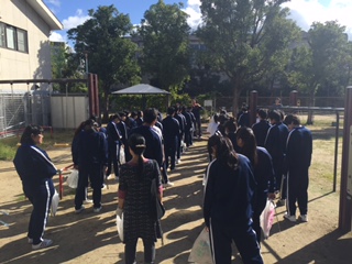 10月29日土曜日 本日は土曜授業として、明日行われます大阪マラソンの前に、地域をきれいにしようという目的で清掃活動を行いました。比較的道路などもきれいで、また、校下小学校でも土曜授業として清掃活動を当てているところもあり、予想よりもごみを集めることができなく、学校に戻ってきました。