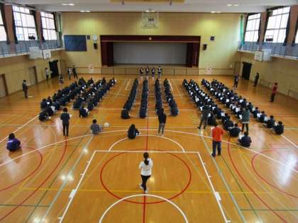 1時間目に中学生は体育館に集まり、中学校生活についてのオリエンテーションを行いました。生徒会のメンバーが前に出て冊子をみながら説明をしてくれました。わかりやすく説明するために、寸劇なども入れて工夫してしっかり説明してくれました。