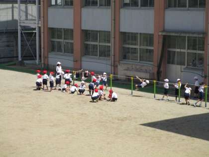 1年生が内グランドで体育の授業です。今日は鉄棒をしています。