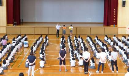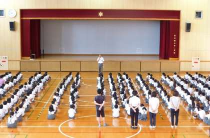 校長先生から、規則正しい生活、宿題をはやく終わらせる、家の手伝いをする、3つのことについてお話がありました。