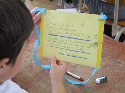 明日の学校案内にむけて2年生が1年生の学級を訪問し、一人一人にカードを手渡していました。