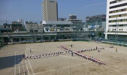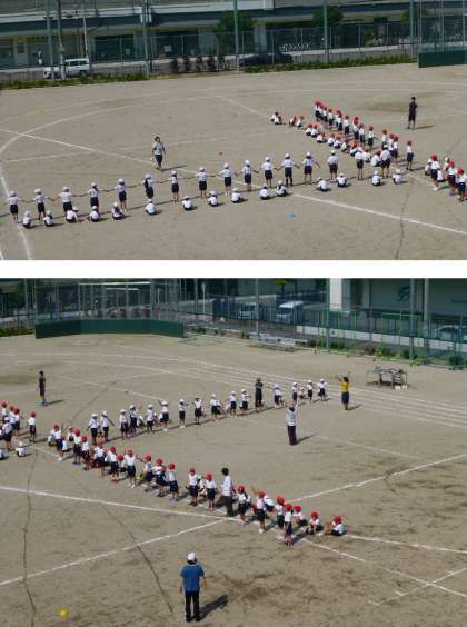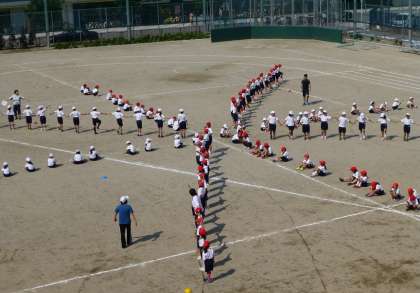 1・2年生が運動場で練習しています。ダンスの振り付けも一生懸命頑張っていましたが、今日は、運動場に出て、隊形移動の練習を頑張っています。